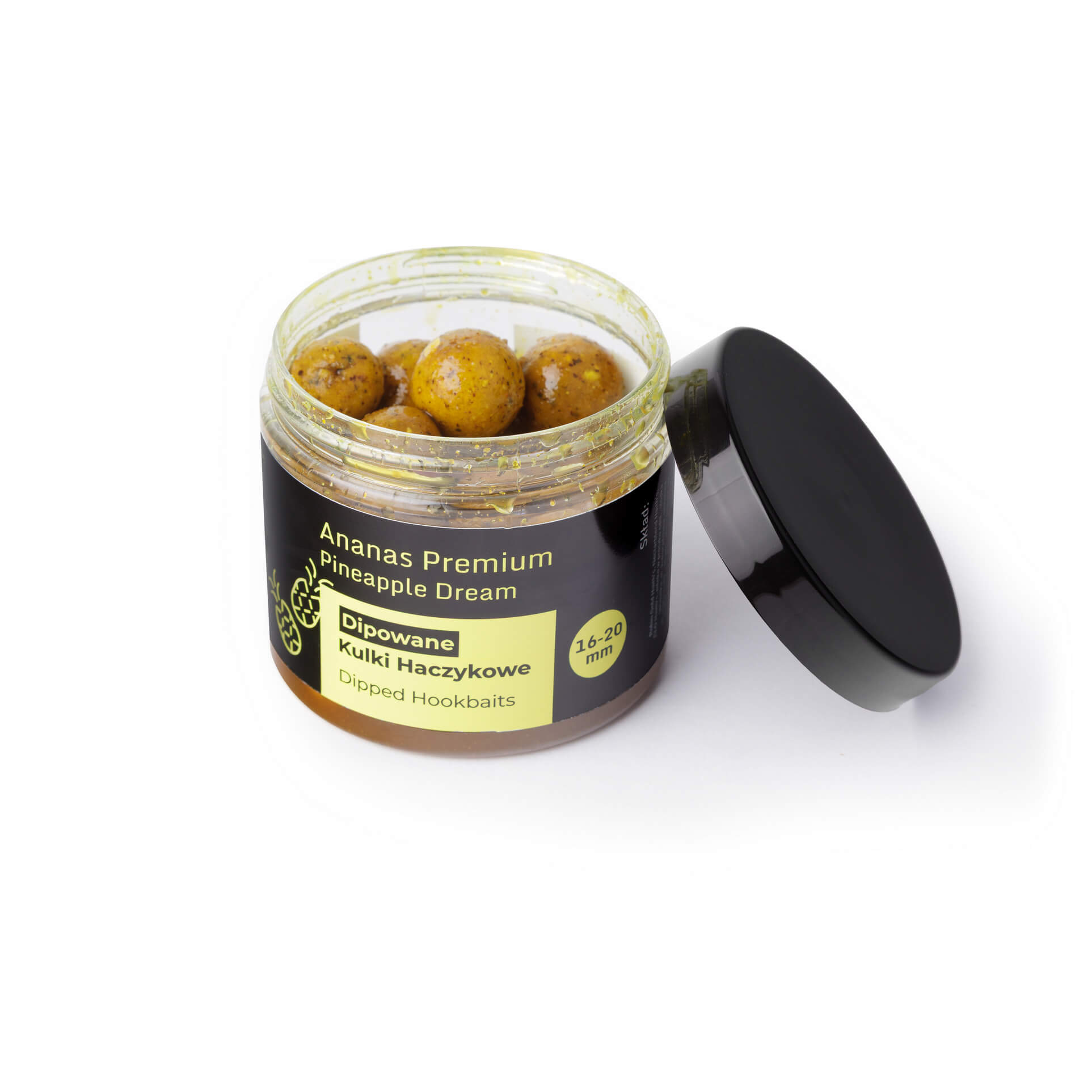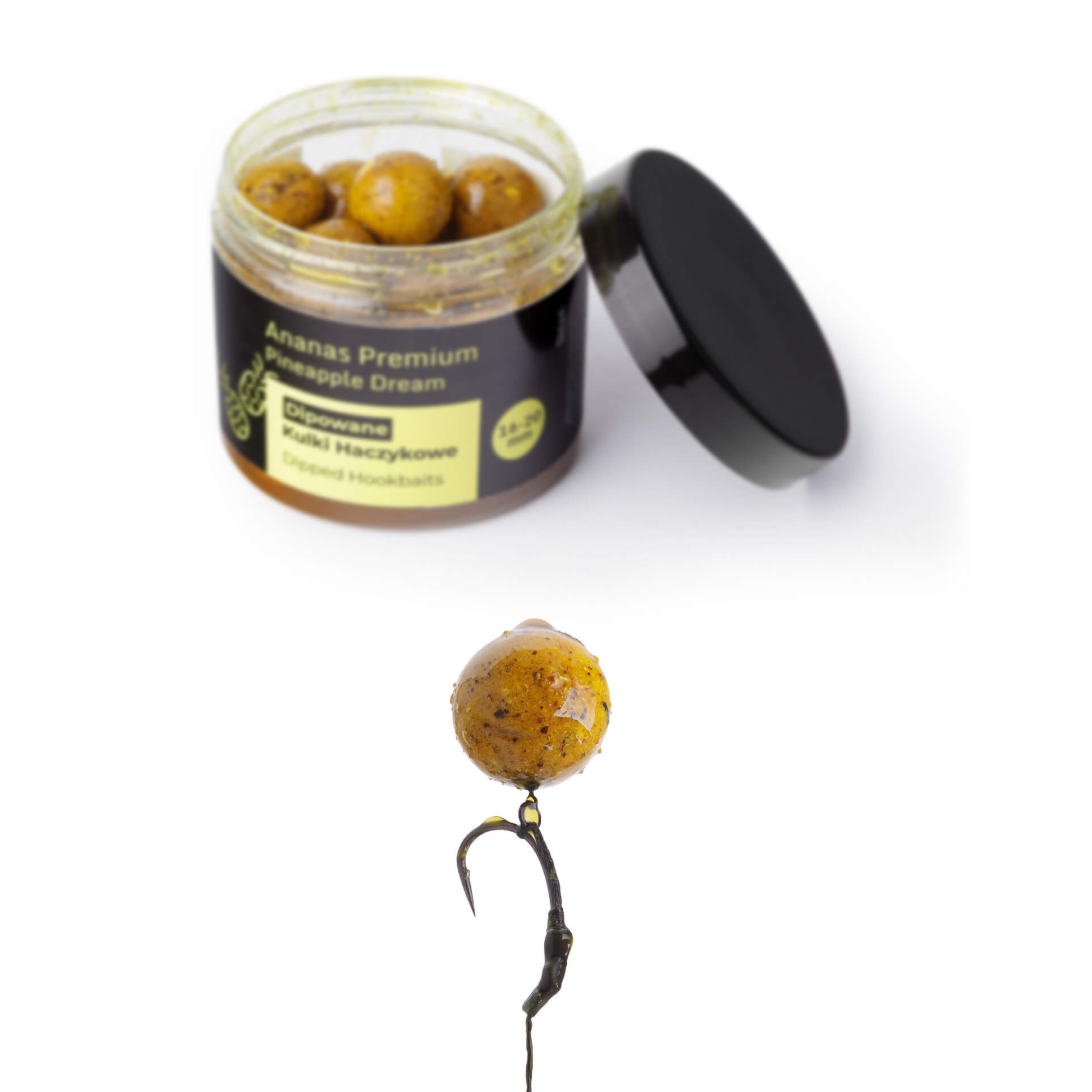 Dipowane Kulki Haczykowe Ananas to połączenie słodkiej, owocowej nuty z intensywną zalewą aminokwasową, które zwiększa skuteczność zestawu od momentu trafienia do wody.